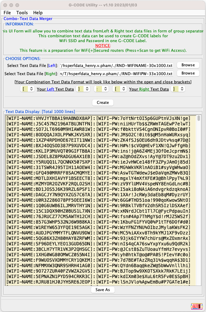 - Then click '_Create_' button to create merged text data file; each text data line can be used for WiFi[+]Secured invention as mentioned which contains WiFi-SSID & WiFi-Password.