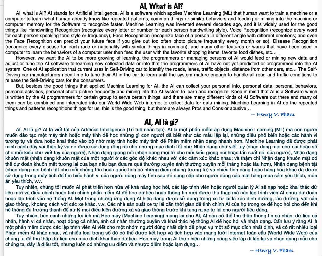 AI, what is AI? AI stands for Artificial Intelligence. AI is a software which applies Machine Learning (ML) that human want to train a machine or a computer to learn what human already know like repeated patterns, common things or similar behaviors and feeding or mining into the machine or computer memory for the Software to recognize faster. Machine Learning was invented several decades ago, and it is widely used for the good things like Handwriting Recognition (recognize every letter or number for each person handwriting style), Voice Recognition (recognize every word for each person speaking tone style or frequency), Face Recognition (recognize face of a person in different angle with different emotions; and even the Face Recognition can predict your future face if you give out too often photo picture frequently every month or so), Disease Recognition (recognize every disease for each race or nationality with similar things in common), and many other features or wares that have been used in computer to learn the behaviors of a computer user then feed the user with the favorite shopping items, favorite food dishes, etc…