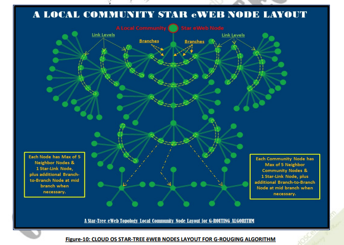 16. Cloud OS will use Invention #9: G-ROUTING ALGORITHM METHODOLOGY as a routing algorithm for the Star-Tree networking topology in 3D World Electronic Web and intended to replace the current Internet Network Backbone which current has many hacking issues that allows the hackers hosting the copy-modify websites from one community to another community with the current routing method of which ever closest server goes first. Another critical issue is the duplicate machine address or IP address will provide the hackers share the same content of current session as the user's view. The Cloud OS machine will handle the data routing and use Neighbor-to-Neighbors routing technology and prevent server machine get kidnap or stolen. The Cloud OS machine has its own star network connections and no need to have the 3rd party routers like currently to prevent unwanted server machines connecting or disconnecting without network notification capability. Note that the Cloud OS Server machine would have 7 Ethernet ports with one Reserved Port and 6 Ethernet Ports for star-tree (1 to 5) Topology plus 2 Additional Ports for Hardware Linker which are hardwired to the Reserved Port and used to create hardware linker to other communities as a shortcut for networking or web-linking faster in routing optimization in the Datacenter. The Star-Tree topology can be configured in the Hexacell Network connections in the Left-and-Right Expandable Circle Network which provides to configure the network with desired limit boundary for great performance and great management in Razone and Rozone network layout; note that Razone is defined as Radius Zone, and Rozone is defined ad Rotational Zone in circle sector degree. The Hexacell Network connections can be used for group of users for a domain or company/organization that have many workers having the data sharing together which should be close together in group of Hexacell Network. The The Left-and-Right Expandable Circle Network server machine would have 2 Left-and-Right physical ports to connect left and right servers to form a complete circle when the circle network is completed, this would give the Webwork connecting in centric infrastructure. The Left-and-Right Expandable Circle Network would be used in combination with Star-Tree Network for Cloud OS eWeb (Interweb) for future of our World of Computing Infrastructure Modern. The Cloud OS WeWeb (Worldwide Electronic [spider] Web) will automatically notify when new Cloud OS network branch is connected or will automatically notify when a Cloud OS server machine is gone missing. The Cloud OS WeWeb will also automatically draw and count the Network eWeb nodes (server machines) around the world.