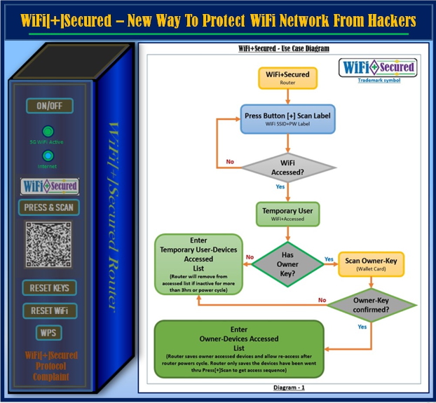 1. WiFi[+]Secured: Invention # 1: New Way to protect WiFi Network from Hackers (short name Wifi[+]Secured); the WiFi[+]Secure is the WiFi router or Wireless Hotspot or Cloud OS Hostspot with Press-and-Scan to have access without showing the WiFi name on user devices to prevent unauthorized into WiFi routers...